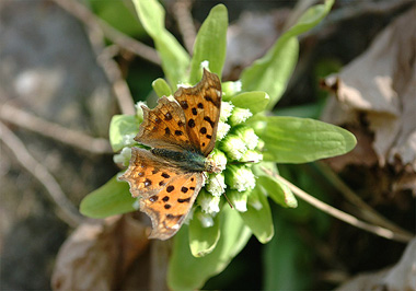 5月を思わせる陽気に蝶が多く舞う。越冬から目覚めたキタテハ3頭がフキの薹で吸密中。傍に近寄ると飛び去るのですが、しばらくするとまた戻って吸密を開始します。よほどこの花が気に入っているのでしょう。