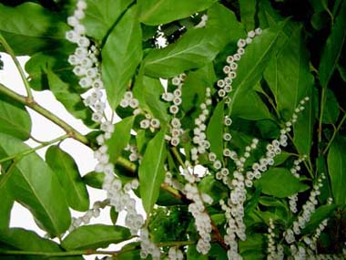 緑の天井から白磁のシェードを一列に吊り下げた様なネジキの花。若緑と純白のコントラスト。