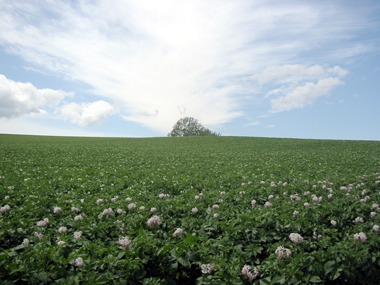 北海道、パッチワークの路と言うところを車で走っていたときに偶然撮れた写真です。芋畑と青空、雷雲のような雲が美しかったので撮ってしまいました。