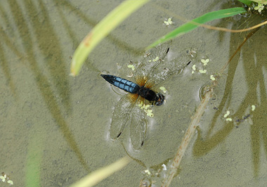 トンボはよく水面に突進して水を飲んでいますが、もしかするとこのハラビロトンボ、失敗して敢え無く溺れて死んだのでしょうか。トンボにとって死は鳥や蜘蛛に捕食される事でもやってきます。
