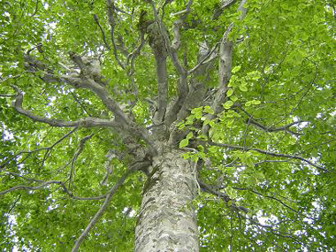 ブナの原生林へ行ったときに撮った一枚です。 冬に雪の重みでほとんどの木が根元の方で少し曲がっています。 この木も写真に写っていませんが、下の方が曲がっていました。 樹皮のまだら模様はコケに似た地衣類が着生してできるそうです。