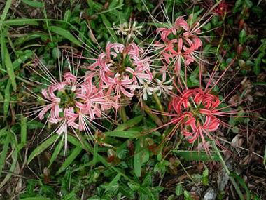 秋になると、赤色で鮮やかに 咲き誇る彼岸花。 一本だけ白い彼岸花を見つけ 珍しいと感激していましたところ その近くでこの花びらの外側から白いのを見つけました。