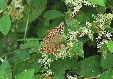 イタドリの白い花にミドリヒョウモンが吸密にやってきました。