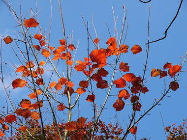 今年の表六甲の紅葉は、台風の塩害で葉が傷められたためほとんど全滅状態ですが、このウリハダカエデは見事に色づいています。