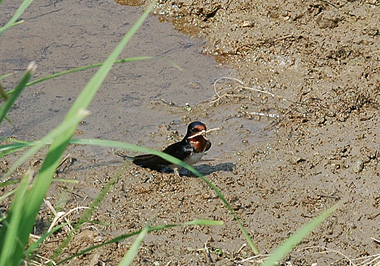 この時期に巣材を集めているのはおそらく二度目の産卵を迎えたのでしょう。近くで枯れ草を咥えてきて水溜りの泥に突っ込み泥をつけています。これを見ると昔の土塀作りを思い出します。