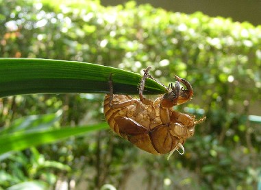まるで軽業師のように浜木綿の葉の先っぽで羽化しました。 不安定な場所で風にゆらゆら と揺れて、さぞかし大変だったでしょうが、無事に飛んで行ったようです。