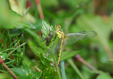 湿地を目を皿のようにしてヒメアカネの羽化を探したが見当たらず、戻ろうとして振り返えると足下に羽化したばかりのトンボが水面から這い上がっている。何のことはない私が近くに足を踏み入れたため草の振動で下に落ちたようだ。 下手をすると踏んづけていたかもしれない。