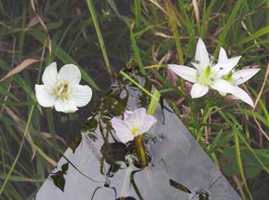水路の中、水路ぎわ、土手斜面と、いろんな環境で様々な花が咲いていました。それぞれの方法で命を リレーしているのだと思うと可憐な花にも頼もしさを感じました。 《左から:◎ウメバチソウ(ユキノシタ科 花弁5 湿地 ◎ミズオオバコ(トチカガミ科 花弁3 水中 ◎センブリ(リンドウ科 合弁花5裂 草原》