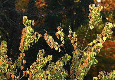木々に囲まれた暗い斜面の途中からナンキンハゼの若木が背伸びしている。
