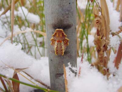 北摂は吹雪いていました。 檜尾川土手、フェンス鉄柱北東側の地上20cmくらいのところで越冬しているのを見つけました。 精巧な瑪瑙細工のような蛹姿で「お菊虫」とも呼ばれています。 無事に春を迎えて羽化しますように。