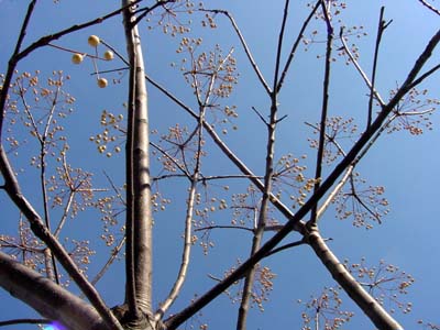 河川敷のところどころで成長続けるセンダンを 見ると、いつもその生命力の強さを感じます。 この木はまだずいぶんと実を付けたままです。近くの別の木の実は小鳥がすっかりと食べてし まっているのですが。 センダンの古名でこの木は「オウチ!」、こっちの 木は「アウチ!」と言いたくなりました。