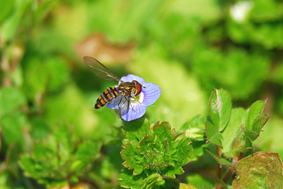暖かなこの日、ハエやアブがいたるところで活動開始。 大きく開いたオオイヌノフグリにはハナアブが吸蜜で大忙し。 近くではナナホシテントウが交尾中。
