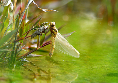 当地に生息するトンボの中で最も早く羽化するのがこのシオヤトンボ。 早朝、水際の草に這い上がり羽化を始め、お昼ごろには飛び立っていく。