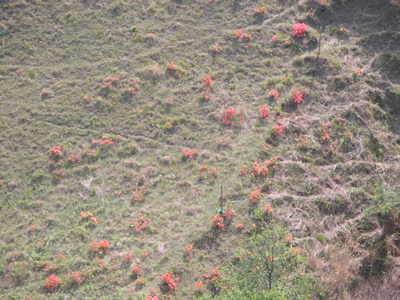 この連休、奈良・若草山の山頂から急峻な東斜面を下ってくる途中、縦横に走るシカ道の中に点々と咲く思いもかけずたくさんのレンゲツツジを見ました。 毎年、連休には藤の花見に奈良公園へ出掛けるのですが、そういえばここ数年、この時期にこちらの方まで来たことがなく、これほどたくさんのレンゲツツジがあることには気がつきませんでした。