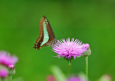 土手ではノアザミが今が盛りと咲いている。 アゲハチョウの仲間がここで吸密しているのをよく見かける。特にアオスジアゲハをよく見かけ、花から花へ忙しなく移動している。 上に向いた前翅はさらに忙しなく震わせている。
