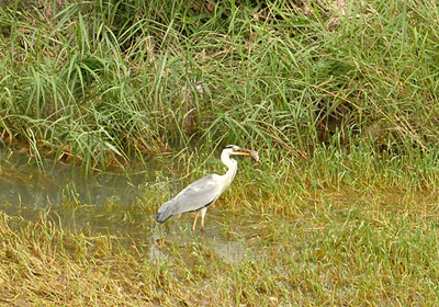 降り続く大雨で余野川も増水。そんな中アオサギが大きな魚をゲット。 その場で呑み込むのかと見ていたがおもむろに岸に上がって獲物を咥え直し、一気に呑み込んでしまった。