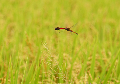 黄金色になった稲穂の上をナツアカネが産卵飛行。よく見ると水のない田んぼに卵がパラパラと落ちていくのが分かる。この日は産卵日和だったのか5組ほどのペアーが見られた。