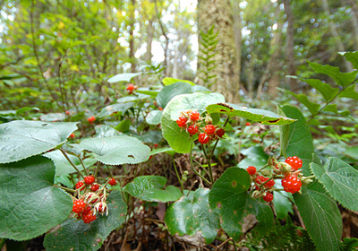 斜面になった雑木林の林床に今年もフユイチゴが群生。 果実は11月から見られ12月に入るとピークを迎えるが、今年は昨年に比べると実の数が少ない。 この赤い実もまもなく鳥や人間に採られてしまう。