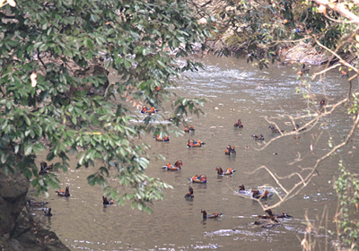 余野川の上流で休息しているオシドリに遭う。20〜30羽はいただろうか。 川の両岸はどちらも急斜面で、左側は山、右側の上には国道が走っているが、斜面に樹木が生い茂り国道から下の川面は見えないので、オシドリにとっては人が近づけない安全な場所。 この群もやがては分散して下流にも姿を現す事だろう。