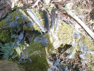 面白い発見をしましたので、報告します。 付近の沢に降りた所をテン?に襲われたようです。 羽根が2箇所に散乱し、死体は持っていったようです。(画像は、鳥を特定する 為に特徴のある羽根の画像中央に移動しています。)