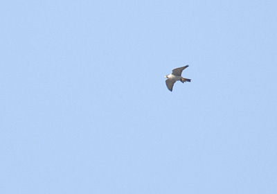 山の方から一直線に飛ぶ鳥、姿や飛び方がいつものタカと違い速度もかなり速い。あとで写真を見るとどうもハヤブサのようだ。さらに写真を見て気付いたのは足に獲物を掴んでいる。拡大してみる鳥の足のようなものが見えるので獲物は鳥のようだ。