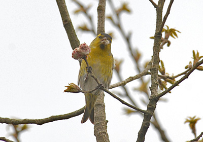10m以上に伸びきったクヌギの樹に30羽以上のマヒワの群、何かをしきりに食べている。若葉か花を食べているのかと思って写真を拡大してみると綿状のものはクヌギハナカイメンフシという“虫えい”であった。クヌギハケタマバチという蜂がクヌギの雄花序に寄生して綿球状に肥大して出来たものだそうだ。