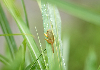 昨年からずっと水が残っている休耕田で、雨露に濡れた草の葉の上に幼体のアマガエル。 ここにはハラビロトンボが縄張りを張っているし、モリアオガエルまでが背の低い草に卵を産んでいる。 このアマガエルもここで生育したのだろうか。