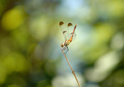 成熟して赤くなり出したリスアカネがちらほら見られるようになった。 未熟の間半日陰の林縁で陣取っていたのが、雄は赤く成熟すると日が当る目立ったところに出てくる。 赤くなった腹部を陽の方向に向けて暑さを和らげているこのポーズが面白い。