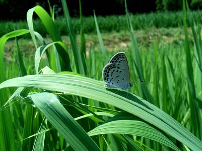 猛暑日続きですが、稲田の広がる里山はしのぎよいです。 花が咲き出した稲の葉上でヤマトシジミ大和蜆も避暑休息 していました。 ツクツクボウシ、ヒグラシの鳴き声も聞こえ、秋が近づいている 気配です。
