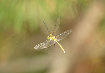 早朝ヒメアカネの羽化を観察していると、近くでマユタテアカネも羽化の最中であった。 まだ飛立たないであろうとその場を離れ、2時間後に再び戻ってくると、何とマユタテアカネは羽化していた真上の蜘蛛の網にかかっていた。 捕えられてまだ時間は経っていないとみえ、時々動いていた。