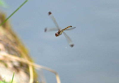 赤トンボのリスアカネが雌単独で産卵中。写真の真ん中辺りに落下する卵が見えている。 リスアカネの産卵は、普通雌雄が連結したまま空中で卵をまき散らすが、雄が連結を解いたあとでも雌単独で産卵を続けている事が多い。写真の個体もおそらくこの直前は連結して産卵していたと思われる。