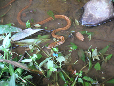 放棄田の山側の水路も昨秋復元し、その水路に餌を追うシマヘビの姿 がありました。 カエルが目的のようで、ハゼ科の稚魚にはおかまいなしでした。