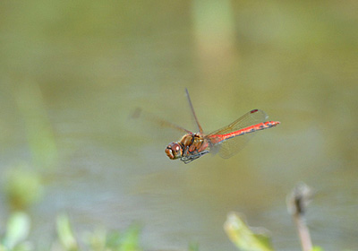 放置された畑に水溜りが出来そこがトンボの活動場所となっている。 この日午前11時ごろまでは日差しがなくほとんどトンボが見られなかったが、日が射し暖かくなった途端、どこからともなくアキアカネの連結ペアーが次々に訪れ、産卵が始まった。 それまでにこの水域ではマユタテアカネとタイリクアカネが水域の周りに陣取っていた。しかし雌が来ないのか交尾には至らず、タイリクアカネは写真のように水面近くをホバリングに近い飛行を続けていた。 タイリクアカネはアキアカネに似ているがこのような行動はアキアカネではあまり見られないもの。