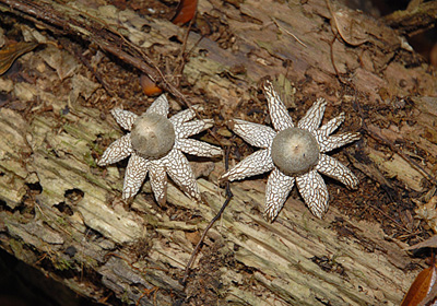 赤や黄色の落ち葉でまるで錦の絨毯のように敷き詰められていたこの日、倒れていた朽木にツチグリが2株、特徴のある形なので直ぐ目がそこに吸い付かれてしまった。 この星型の外皮は湿っているときは開いているが乾くと再び閉じて球状になるようで、その後何度か見たが確かに外皮は開いている時と閉じている時がある。 閉じた時は真ん中の袋を押しつぶし中の胞子を飛散させるようである。