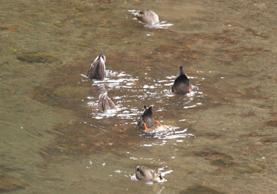 川で15羽ほどのカルガモが逆立ちした姿勢で頭を水中に突っ込んで何かを採食している。この動作を何度も繰り返していた。 川底に種子などの食べものが沈んでいるのか、あるいは水草でも食べているのだろうか。