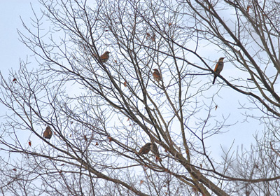 ツグミの初見は暮れの21日だったが群を見るのはこの日初めて。15m以上の高い樹の枝々に20羽ほどのツグミが休んでいた。春になると公園などの草地で採食しているツグミが間近で見られるがこの時期はまだ警戒心が強く樹に近づくだけで逃げてしまう。