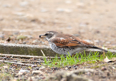 繁殖期の春が近づくとツグミは公園など草地に降りて昆虫の幼虫などを啄ばんでいる姿をよく見かける。 冬の間は樹上で木の実などを啄ばんでいる姿がよく見られるが、この日ツグミは公園の地面に降りて落ちているトウネズミモチの黒い実を啄ばんでいた。