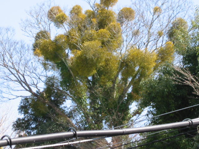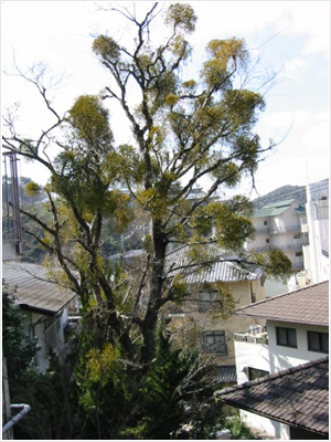 有馬温泉街個人宅庭先のエノキに寄生。隣の家主さんの話では、20数年前に来た時からです。 寄生されたエノキは弱ることなく不思議です。 有馬温泉街では、この他サクラ等にもあちこちで見ることが出来ます。