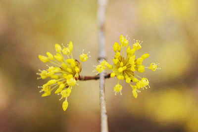 中国、朝鮮原産。江戸時代に薬用植物として渡来した。花は3〜4月、葉が展開する前に開花する。 写真に見られるように短枝の先に2〜3cmの散形花序を出し、淡黄色の小さな花を多数つける。