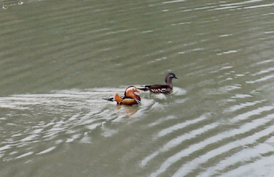 千里中央の安場池にオシドリが飛来している。聞くところによると昨秋より10羽程度が飛来しているとのこと。 警戒心が強く、なかなか表舞台にでてこないようであるが、この時運よくつがいが出て来てくれた。