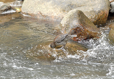 この日、2羽のカワガラスの雛がいつもの餌場(休息地)に来たのは午前10時過ぎ。しばらくはそこで休息していたが、10時半頃から近くで採食を始めた。 巣立ちから10日目の雛はもう親鳥と同じように盛んに採食活動を行なっていた。 雛を見たのはこの日が最後で、独り立ち出来た雛は多分上流に移動して行ったのであろう。