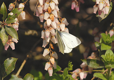 今年は3月18日にモンシロチョウを初めて見たが、この日は暖かく、テングチョウなど成虫で越冬した蝶に混じって広い範囲でモンシロチョウも見られ、植木畑に植わっていたアセビの花で吸密している個体も見られた。