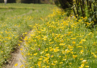この畦道はタンポポに負けじと同じ黄色の花をつけたキンポウゲで埋まっている。