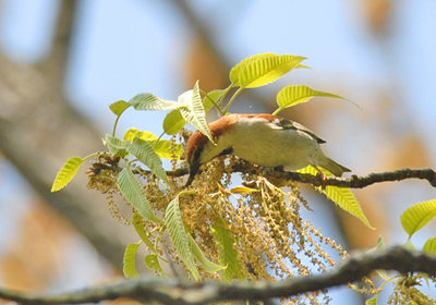 オオルリを見かけたクヌギ林にこの日30羽以上のニュウナイスズメの群がやって来た。本種は近畿地方では冬鳥だが当地では4月下旬に見られる通過鳥。この時期クヌギは花序が垂れ下る時期でこれを採食するためにここを訪れているのだろうか。