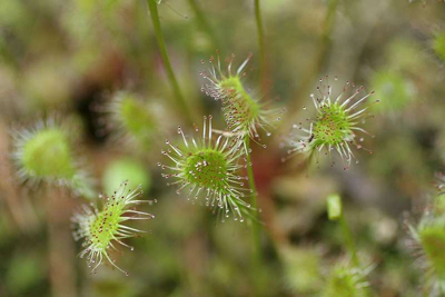 日当たりのよい湿地に生える食虫植物。葉は株の根元から生え、表面には粘液のついた 紅紫色の毛が生え、小さい虫はこれに触れると動けなくなり、毛から出る液で消化されると のこと。名前は一面に毛がはえた葉を毛氈に、小型であることをコケに喩えてつけられた。 花期は6〜8月、白色で一つの花茎に10数個つける。