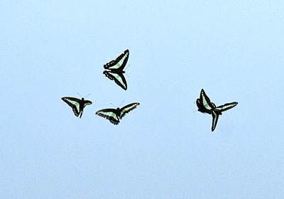 オランダガラシの花にとまっていたアオスジアゲハが徐々に増えて周りに乱舞しだした。 最初4頭だったのがピークでは7頭が絡み合って上空へ飛んで行った。雌を雄が追っているのか、求愛なのか、ただの戯れなのかは判らない。 以前モンシロチョウで同じ乱舞を見たが、この時は群の中にスジグロシロチョウがいて、それをモンシロチョウが追っかけていたものだった。