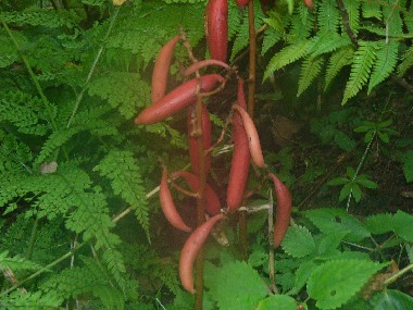 ソーセージがぶら下がっているような感じのツチアケビの実、アケビの実に似ているのでこの名前がついたそうだ。 葉緑素を持たず光合成をしないので、ナラタケから養分をもらって育つ。