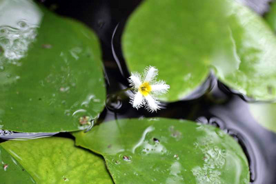ビオトープの池にアサザと一緒に咲いていた。池の淵から少し離れたところに咲いていたので翌日撮り直そうと思い出かけたが、花の跡形なく、調べたら一日で花を閉じ水面下に潜ってしまうとのこと。花期は7〜9月、花冠は深く5裂し、裂片はさらに糸状に細かく裂けている。
