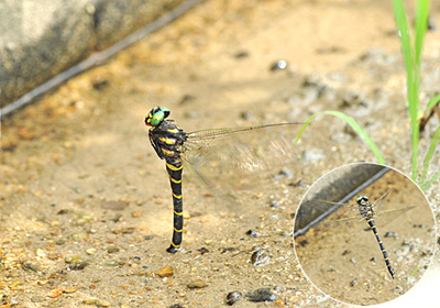 ミヤマアカネの羽化水域と同じ溝でオニヤンマの雌が産卵していた。 オニヤンマの産卵はダイナミックで、水面上数cmの位置から、写真円内のようにやや前傾姿勢から腹部先端の産卵管を砂利の中にほぼ垂直の状態になるように差込み、卵を産み付けている。1秒弱のサイクルで連続的に小気味良く産卵管を差し込んでいて、耳を澄ますと「シュッ シュッ・・・」という音が聞こえてくる。