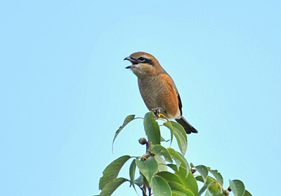 放置された小さな植木畑は樹々が生い茂りモズの棲みかになっている。 今年はここで2回産卵が行なわれたようでずっと幼鳥が見られた。いつ来てもモズの鳴き声が聞けたがこの日は樹の天辺でさえずっていた。どうも初秋から始まる採食のための縄張宣言のようだ。 それにしても正面から見る鳴き面は面白いものだ。